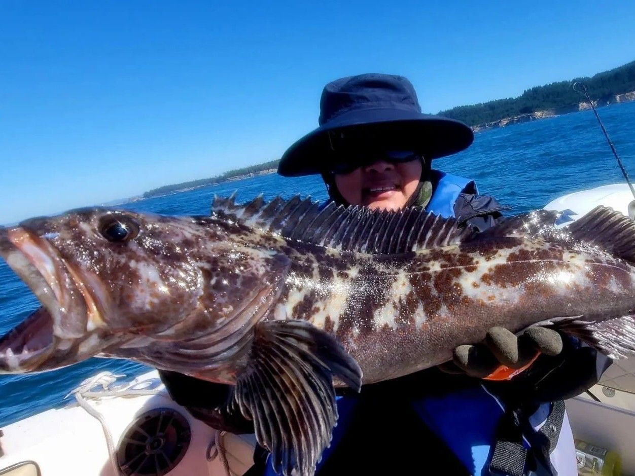 Last but not least, Lingcod. Don't let the name fool you – these aren't cod at all, but they sure are tasty. Lingcod are aggressive feeders with a mouth full of sharp teeth, so when they hit your bait, you'll know it. They love structure, so we'll be targeting rocky areas where they like to ambush their prey. The cool thing about lingcod? They come in a variety of colors, from blue-gray to greenish, and some even have a wild blue tint to their meat (don't worry, it cooks up white).